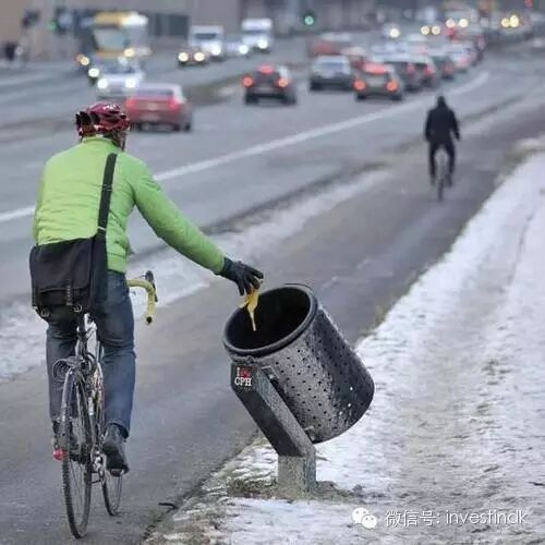 丹麦在环保路上还有很多小细节小心机,细细探索你就会发现它为什么能立下雄心壮志要在2050年彻底摆脱使用石化燃料了。比如垃圾桶歪个脖子是做啥?原来是为了方便骑行者扔垃圾。