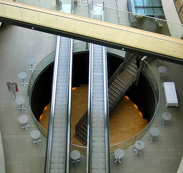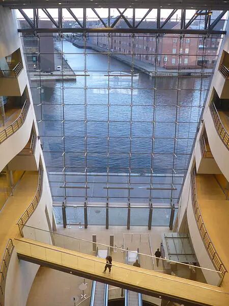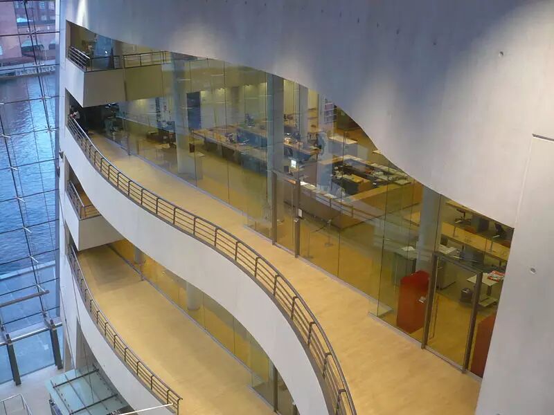 “中庭”也是图书馆的建筑亮点。一条大型分割线将大楼分成两部分,使中庭光线充盈。中庭连接着城市与外面的大海,也连接着图书馆的新旧大楼,重达1公吨/米的铁框梁托起玻璃墙面。