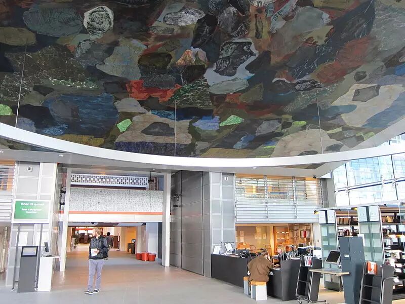 而著名画家Per Kirkeby的200平方米巨著点缀着黑钻石图书馆的天花板。而在这座建筑的顶层,透过玻璃幕墙向港口望去,可见运河水道、游艇泛舟的美景,更是奇妙。