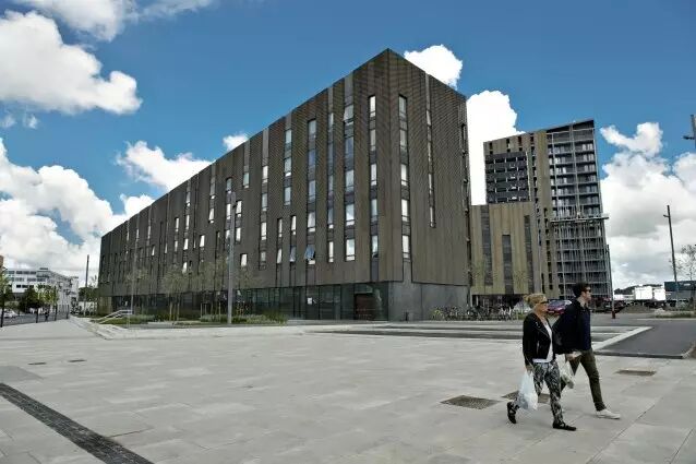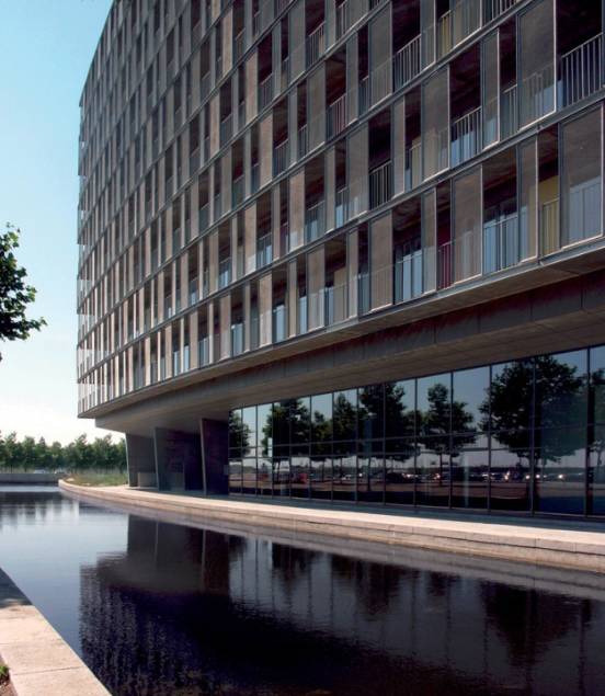 海滨城市奥尔堡的新宿舍楼可以说是不对称设计的典范:一部分由西向东从2层楼高上升至7层楼高,另一部分由南向北从3层楼高上升到14层楼高。屋顶的坡度象征着从城市向海港的过渡,站在阳台上二者景色兼收。学生可以穿过中庭直接到达靠近港湾的奥尔堡大学新校区。然而,相似的外观、颜色、建筑材料和建筑布局又使得这两个不同的部分浑然一体