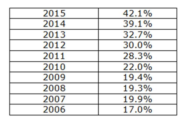 2015年,丹麦风能发电再一次创历史记录,风力发电量占总发电量的42.1%,该占比位居全球首位。相比2014年,丹麦风力发电量占发电总量的39.1%。丹麦西部的风力发电更是超出丹麦西部能源的总消耗。过去十年丹麦风能占比