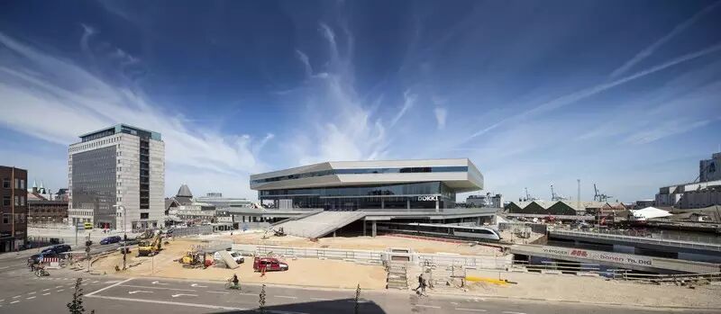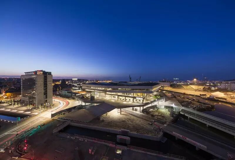 其中最大的多边形大楼位于奥胡斯河口,连接着城市的港口和水运。南北两侧是森林,依托建设新的轻轨,以及专属于Dokk1的轻轨站,这里将会形成一个休闲中心。 通过道路交通的调整,车辆能直接进入大楼底层大型停车场。新的环状通道贯穿整个项目可以容纳450辆自行车停放。Dokk1将成为奥胡斯市的重要枢纽。