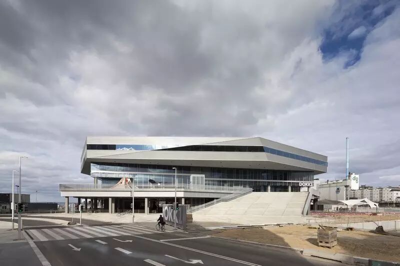 Dokk1的顶部为一个多边形薄片结构,主体为一个光滑的玻璃大楼,底座为大型石刻楼梯,呈扇形连接着街面,周围环绕着新的港湾大道。玻璃大楼设计成一个开放的城市空间,拥有360度水域、海港、森林和城市的景观。此外,整个建筑没有前后之分,目的是为了强调多边形顶部结构所带了的视觉上的旋转和韵律感。