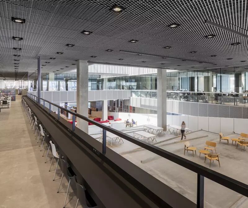 顶层多边形的办公室可以作为政府行政办公也可用来租赁。两层开放的图书馆与媒体坡道相连,组成五个平台,分别可以举办展览、游乐、互动工作室、阅读和活动。媒体坡道同时连接着文学和媒体区域,作为一条漫步通道可供活动时用,穿过大楼可以抵达顶层的儿童区。