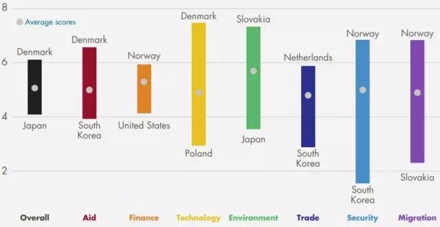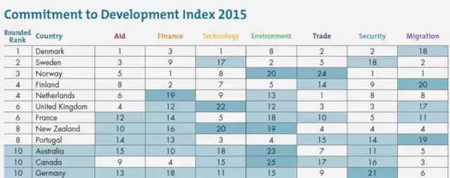 丹麦在上述7个方面表现可圈可点,在援助和技术方面更是排名第一。对发展中国家的进口限制、对贫困、非民主国家出售武器、限制与发展中国家分享技术以及危害共有环境资源的政策都将减分。下面就来具体看看丹麦的表现吧。