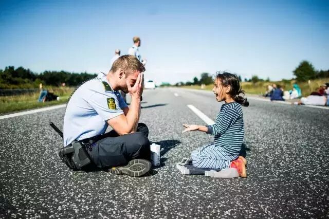 一张感动了千千万万人的图片。丹麦警察在国境线上陪难民小女孩玩耍。