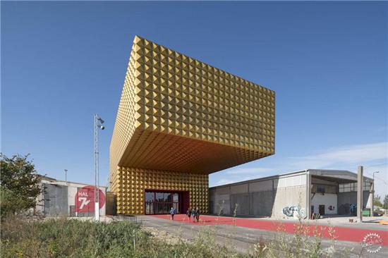 由MVRDV 和COBE建筑事务所共同设计的Ragnarock是一个关于流行文化、摇滚和丹麦罗斯基勒青年文化的博物馆,它将作为当地摇滚乐的一个象征,以激励新一代的音乐家、艺术家和专业创意人士。这个3100㎡的建筑有着巨大的悬挑结构,建筑的主要功能为博物馆,其中还包含一个礼堂、行政设施和一个酒吧。这个金光闪闪的建筑是作为后面占地11000㎡的ROCKmagneten总体规划的门户建筑,整个ROCKmagneten项目拟将现有的水泥工厂转变为用于传播摇滚音乐和青年文化的场地。同时,场地中还加入了三个新的建筑:已建成的Ragnarock、丹麦新højskole项目和罗斯基勒摇滚音乐节总部。 这个为丹麦摇滚博物馆设计的 Ragnarock,旨以一种较为柔和的方式与现有的基地保持联系,并保留现有基地原始而随意的样貌,此外,这也是为了适应滑板爱好者和艺术家们的共同需求。新结构插入到原有工厂内部,它靠4根柱子支撑,这些柱子会将游客引导至博物馆和礼堂内。建筑靠不同的材质来区分新旧体量;原始混凝土与鲜艳的红色铆钉形成对比。这种材料的组合表现出一种类似岩石的感觉;从金色氧化铝镶嵌的外立面(为了致敬摇滚老前辈)到鲜艳的红色室内装饰,让人联想到吉他盒里面填充的柔软的天鹅绒内里。 “Ragnarock将摇滚音乐转换成建筑语汇:能量、挑战、叙述。响亮而直接! ” MVRDV的创始合伙人Jacob van Rijs说 :“这不仅从建筑外观上表现出来。Ragnarock和原始大厅之间将会塑造出新的空间,这种充满创意的环境将会培育出新一代的摇滚明星。” 在穿越整个建筑的过程中,游客将会感受到作为摇滚明星的生活体验,并且将传统博物馆形式和身临其境的展览相结合。入口的红地毯给人们一种表演空间的感觉,它大胆地悬挂在空中,好似要坠落到其下的酒吧间一般。“当游客们踏着红地毯走向黄金建筑时,他们仿佛都摇身一变成为了明星。 ” Jacob van Rijs阐述了博物馆的构思。Ragnarock本身也将成为一个舞台,表演既可以面对一侧的大型公共广场,,也可以面对另一侧翻新的工业大厅。这个金色建筑以一种真正的摇滚风格来对抗地心引力,不仅欢迎参观者进入博物馆,在未来也将成为进入ROCKmagneten规划项目的门户建筑。 这个项目在社会层面的目的是为了通过提供一个将教育、休闲和表演联系在一起的包容性环境,为音乐创新提供新的可能性。由Ragnarock主导的建筑本身通过紧扣主题的空间塑造(如户外广场),也通过新的社会平台(非正式平台)来孕育创造力。 Ragnarock作为未来发展的催化剂,在其周边环境中也脱颖而出。建筑编辑Karsten Ifversen在丹麦日报中将这个博物馆描述为一个现代的大教堂。“在过去,大教堂就是这么建的:始于未知的领域。你将它们建在偏僻的地方,然后城市围绕在其周围逐渐地发展壮大。”Ragnarock是创意郊区Musicon新总体规划的第一个成员。在未来几年,我们将会看到更多新成员加入其中:摇滚højskole,一个螺旋状体量的再生混凝土工厂大厅,以及Roskilde摇滚音乐节住宅,它将创造一种充满活力的动态生活环境来为未来højskole的学生和教师服务。MVRDV和COBE将继续完成下一阶段规划的任务,期待着他们未来的表现。
